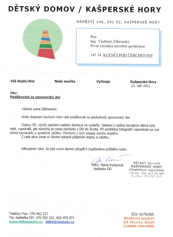 chtěl bych poděkovat firmě První Chodská za Fotbalové utkání kde mi byl předán šek na výbavu bytu, ve kterém budu bydlet.