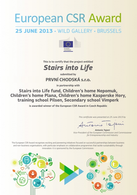 Projekt Nadační fond Schody do života si jel převzít cenu European CSR Awards do Bruselu za Českou republiku v kategorii Malá firma. Tohoto ocenění si velmi vážíme a věříme, že našemu projektu pomůže s jeho růstem a rozšířením se do podvědomí dalšího okruhu společnosti.