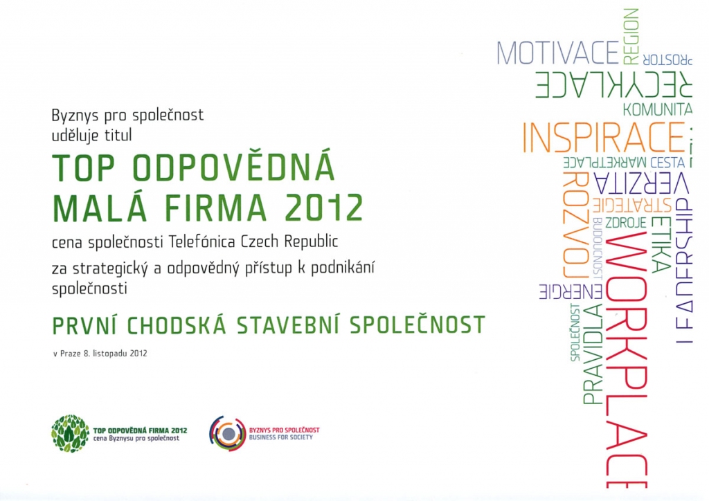 Dne 8.11.2012 proběhl slavnostní galavečer s vyhlášením cen v České národní bance v Praze. Přihlásili jsme naši společnost do kategorií TOP ODPOVĚDNÁ MALÁ FIRMA a PRACOVIŠTĚ BUDOUCNOSTI. V kategorii TOP ODPOVĚDNÁ FIRMA 2012 jsme věnovali pozornost projektům, které vytváříme, především Nadačnímu fondu Schody do života. K našemu milému překvapení se tento den připsal k dalším takovým, které ve vás nechají vzpomínku na celý život a získali jsme první místo v této kategorii. Tato cena je pro nás velkou odměnou a uvědomění si toho, že ne vždy by se mělo točit vše o byznyse, ale také i o dopadech pro společnost. Velmi si vážíme takového ocenění.