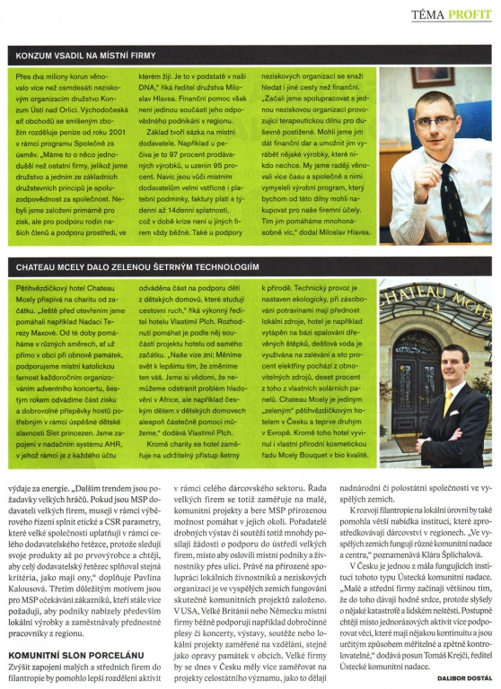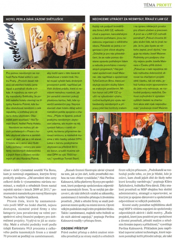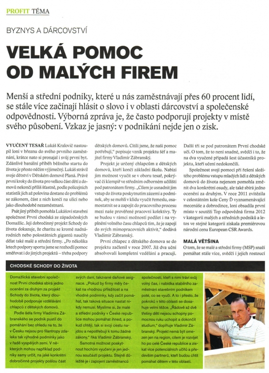 Na začátku byla otázka, jak dát nějaký řád sponzorským aktivitám, kterým se firma První chodská věnuje už léta. Výsledkem byl nápad, který získal dnes už i mezinárodní ohlas a nedávno přinesl První chodské i domácí ocenění v žebříčku TOP Filantrop 2009 za Rozvoj partnerství ve prospěch komunity. V projektu Schody do života podporuje První chodská kluky z dětských domovů tím, že jim s pomocí dalších partnerů a odborných garantů dává příležitost k vyučení a případně i další profesní kariéře. .... celý článek najdete zde nebo zde.